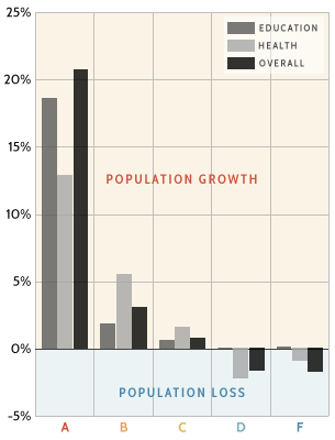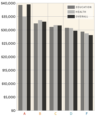 The grades were given based on a curve, with equal numbers of As and Fs, and of Bs and Ds. High-quality research hasn't yielded a sufficient weighting for each category, so we simply provided grades for each county based upon the average ranking of the data within each category. The more variables in each, or the more analytically derived the data (like school test scores), the more reliable the ranking. The reason for this is that data sets tend to be covariates or move together. Regions with low levels of educational attainment tend to have fewer well-performing schools. Places with high rates of one type of morbidity (poor health) tend to have high rates in several others. So the use of more data in each category tends to minimize the statistical bias a single datum may have.